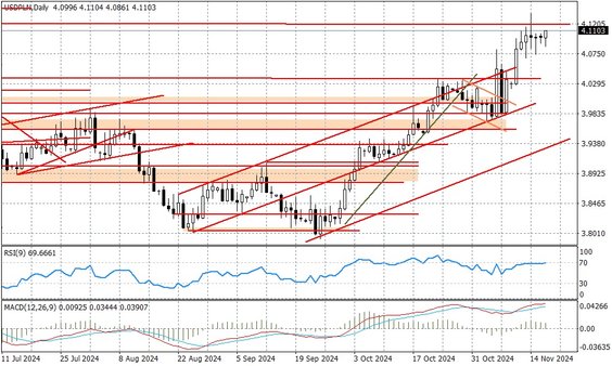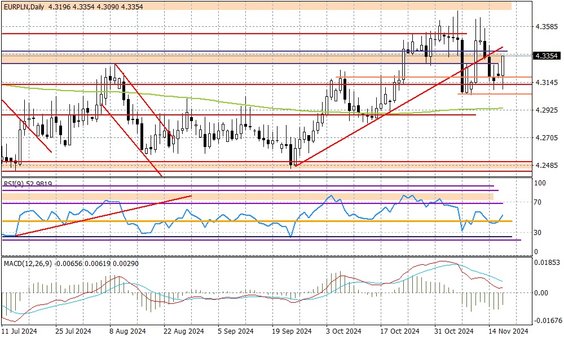 Technicznie rosną szanse na złamanie dołka przy 1,0495 z ubiegłego tygodnia i test kluczowych okolic 1,0450. Dane makro opublikowane w ubiegłym tygodniu z USA, a także ostrożny komentarz Jerome Powella (w temacie kolejnych obniżek stóp procentowych), oraz rynkowe spekulacje, co do przyszłej polityki Trumpa - to argumenty za tym, aby dalej utrzymywać oczekiwania, że FED może być mało chętny, co do luzowania polityki. Obecnie rynek daje 62 proc. szans na cięcie w grudniu o 25 punktów baz., oraz wycenia tylko jeszcze dwie obniżki stóp w 2025 r. (poza tą w grudniu 2024 r.). Tymczasem silny dolar ma swoje konsekwencje dla rynków wschodzących i to niezależnie od tego. że ostatni przekaz od naszej Rady Polityki Pieniężnej pozostał "jastrzębi".