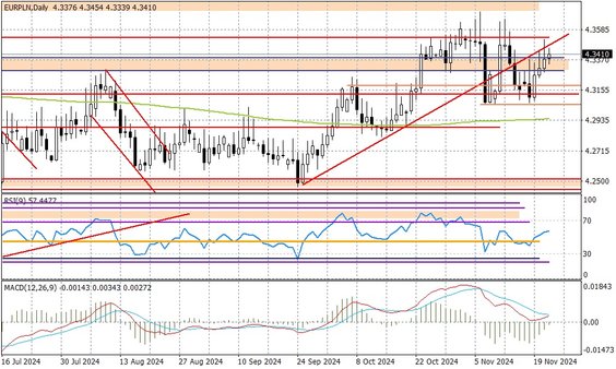 Raczej nie. Ryzyko geopolityczne pozostaje podniesione po ostatnich groźbach Rosji wobec Zachodu i eskalacji konfliktu pomiędzy Rosją, a Ukrainą. Mamy też rosnącą niepewność, co do perspektyw gospodarczych dla Polski - ostatnie dane PKB za III kwartał wypadły słabiej, a dodatkowo mamy nadal kiepskie dane z Niemiec i obawy decydentów w strefie euro, co przyniesie polityka Donalda Trumpa (wojna handlowa). Kluczowy dla złotego pozostaje w krótkim okresie EURUSD, a tutaj mamy wzrost oczekiwań na głębsze cięcie stóp przez Europejski Bank Centralny w grudniu (50 proc. szans za cięcie, stóp o 50 punktów baz.), przy rosnącym ryzyku pauzy w tym czasie ze strony FED (rynek daje jedynie 57 proc. szans na obniżkę o 25 punktów baz.) Para EURUSD narusza teraz kluczowe okolice wsparcia przy 1,0450, co podbija ryzyka dyskusji o zejściu nawet w rejon parytetu (1,00) w perspektywie kolejnych tygodni. W takiej sytuacji założenie, że złoty teraz znajdzie swój poziom równowagi może być błędne. Zwłaszcza USDPLN miałby większą przestrzeń do ruchu wyżej, a EURPLN najpewniej przetestowałby okolice 4,37.