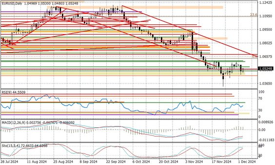 Notowania EURUSD wybroniły wczoraj wsparcie przy 1,0450, które jest kluczowe z długoterminowego punktu widzenia. Dzisiejszy powrót ponad poziom 1,05 to sygnał, że rynek raczej skłania się do budowy struktury wzrostowej, czego potwierdzeniem powinno być wyjście ponad poziom oporu przy 1,06. Czy dojdzie do tego w tym tygodniu? Przed nami informacje dotyczące sytuacji politycznej we Francji, oraz ważne odczyty z USA (dzisiaj JOLTS, jutro ADP i ISM dla usług, a w piątek dane Departamentu Pracy), które mogą podbić zmienność. Niemniej, jeżeli rynek będzie podbijał "gołębie" oczekiwania wobec FED, to dolar może mieć przestrzeń do korekty. Z kolei w przypadku euro to rynek daje jedynie 15 proc. szans na to, że ECB mógłby ściąć stopy procentowe aż o 50 punktów baz. na posiedzeniu zaplanowanym na 12 grudnia. Dominujący scenariusz to ruch o 25 punktów baz.