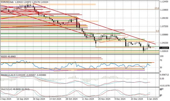 Odbicie z ostatnich dni było krótkie, już wczoraj rynek pokazał, jaki jest dominujący trend - spadki EURUSD. Wyższa inflacja w strefie euro za grudzień została zignorowana, a rynki skupiły się na dobrych danych z USA i kolejnych kontrowersyjnych wypowiedziach Trumpa. W efekcie dalej widoczna jest gra schematem - FED wchodzi w pauzę w temacie obniżek stóp, więc dolar powinien być dalej silny. Dzisiaj po południu kolejne dane z USA, a wieczorem zapiski z grudniowego posiedzenia FED. Teoretycznie powinny wpisywać się w tą dolarową narrację. Niemniej układ szybkich dziennych wskaźników na EURUSD dopuszcza sytuację w której to mamy poszukiwanie dna i budowę konsolidacji pod potencjalny ruch w górę za kilkanaście dni - tu jednak wiele będzie zależeć od obrony wsparć przy 1,0265 i dołka przy 1,0223 z 2 stycznia.
