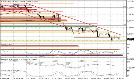 Para EURUSD pozostaje wokół 1,03 czekając na ważne dane Departamentu Pracy o godz. 14:30, które zwyczajowo podbijają krótkoterminową zmienność. Na wykresie widać, że dominuje trend spadkowy, co zwiększa prawdopodobieństwo testowania okolic wsparć przy 1,0223 i 1,0265 jeszcze dzisiaj po południu. W tle mamy cały czas też wątek wysokich rentowności amerykańskich obligacji i utrzymującego się napięcia na rynkach przed objęciem władzy przez Trumpa w dniu 20 stycznia. Opory to 1,0332, 1,0350 i okolice 1,04.