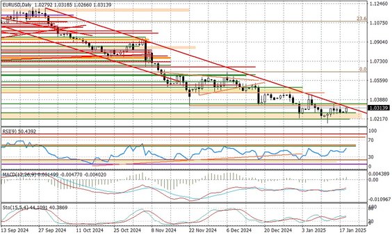 Para EURUSD nieco dzisiaj rośnie i oddalamy się od okolic 1,03. Przed nami test kluczowego oporu przy 1,0332, gdzie mamy też linię spadkową trendu. Wsparciem dla EUR są komentarze Schnabel i Holzmanna z ECB, choć na razie nie widać większego ruchu na oczekiwaniach, co do ścieżki stóp procentowych w strefie euro. Kluczowy dla EURUSD w krótkim okresie będzie jednak Trump - jeżeli rynki nie zobaczą w pierwszych dniach jego rządów skokowego wzrostu taryf celnych, to dolar się osłabi, a część walut (w tym euro) mocniej odreaguje. Wiele będzie też zależeć od tego, jaki sygnał Trump wyśle do Putina - szybkie negocjacje w temacie Ukrainy mogą dodatkowo podbijać temat korekty wzrostowej na EURUSD. Po możliwym złamaniu 1,0330-50, kolejne ważne rejony do testowania to 1,0450 i 1,0600.