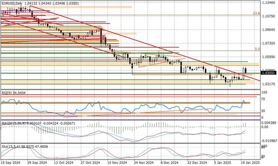 Wczorajsze wybicie na EURUSD było mocne i raczej trudno interpretować je jako tzw. fałszywy ruch. Tym samym bardziej prawdopodobny scenariusz to ruch powrotny (co teraz ma miejsce) i kontynuacja. Wiele będzie zależeć od tego, jakie informacje będą napływać w temacie ewentualnych taryf celnych na UE (na razie jest cisza), oraz czy nie zobaczymy jakichś "kontrolowanych przecieków" przed posiedzeniem Europejskiego Banku Centralnego zaplanowanym na 30 stycznia b.r. O ile w temacie cięcia stóp o 25 punktów baz. rynek jest zgodny, o tyle w kwestii liczby obniżek w całym 2025 r. jeszcze wiele może się wydarzyć.