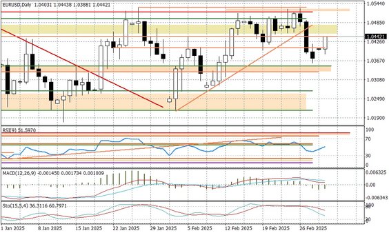 Dzisiaj para EURUSD próbuje odbijać po spadkach z ubiegłego tygodnia. Ryzykowne aktywa (giełdy i krypto) też łapią oddech. Dla euro wsparciem są opublikowane dzisiaj lepsze, finalne odczyty PMI dla przemysłu, oraz wstępny odczyt inflacji (bazowa HICP spada wolniej, niż oczekiwano). Wydaje się jednak, że w obliczu wielu ryzyk (brak szybkiego rozwiązania w temacie Ukrainy i niepewności gospodarczej za sprawą możliwych ceł na UE), które mogą eskalować, szanse na wyjście EURUSD ponad kluczowy opór 1,05-1,0530 są małe. To, co obserwujemy teraz wokół dolara (korekcyjne cofnięcie) raczej zbiega się z tym, co widać na kontraktach na Wall Street. Jeżeli w kolejny dniach risk-off wróci, to EURUSD ponownie zejdzie poniżej 1,04. Zwłaszcza, że średnioterminowe sygnały raczej już padły w ubiegłym tygodniu - to perspektywa wracania w stronę wsparć przy1,02 , być może do końca marca.