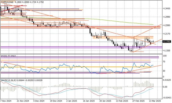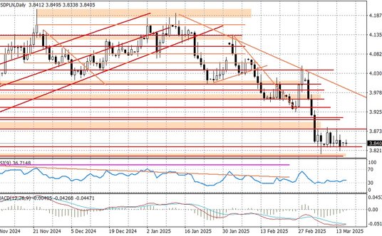To pokazuje, że rynek walut zaczyna koncentrować się już na zaplanowanych na ten tydzień posiedzeniach banków centralnych, z czego kluczowy będzie FED w środę. Ostatnio inwestorzy uparcie wierzą w to, że Rezerwa Federalna wróci do cyklu obniżek stóp procentowych już od czerwca. Ale to jak w tym tygodniu zachowa się EURUSD? Odpowiedź na to nie jest prosta, gdyż w tle mamy też oczekiwania, co do kolejnych ceł Trumpa (prezydent USA powtarza, że od kwietnia ruszą tzw. cła wzajemne), a jutro odbędzie się ważna rozmowa telefoniczna pomiędzy Donaldem Trumpem, a Władimirem Putinem ws. przyszłości Ukrainy. To będzie też rzutować na sytuację wokół złotego.