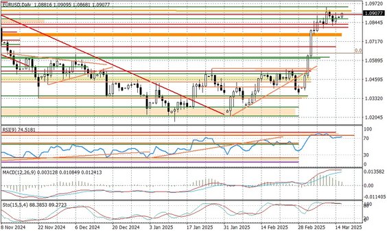 Euro jest wspierane przez oczekiwania, co do szczegółów europejskiego stimulusa infrastrukturalno-zbrojeniowego, oraz plotki wokół rozmowy Trumpa z Putinem, jaka będzie mieć miejsce jutro. Z kolei dolar zaczyna słabnąć na głównych ustawieniach przed ważnym przekazem z posiedzenia FED w najbliższą środę. Technicznie rosną szanse na ponowne naruszenie oporu z listopada ub.r. przy 1,0936 i testu rejonu szczytu przy 1,0947 na bazie szczytu z 11 marca.