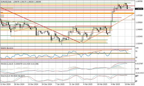 Para EURUSD weszła w korektę ostatniego ruchu, a na atak na 1,10 będziemy musieli poczekać? Na to wygląda. Uwagę zwraca dzisiaj też słabość niemieckiego DAX i innych europejskich indeksów, co może mieć związek z wystąpieniem szefowej ECB, która "przypomniała" rynkom o ryzykach, jakie mogą nieść ze sobą amerykańskie cła, które wejdą w życie 2 kwietnia. Dalej nie znamy ich wysokości (czy USA policzą też za VAT?), ale ECB już szacuje, że może to pomniejszyć wzrost gospodarczy o przynajmniej 0,5 punkta proc. Z drugiej strony dolar odbija dzisiaj na szerokim rynku, a na Wall Street mamy lepsze nastroje. FED potwierdził wczoraj, że rynki mogą mieć rację, co do dwóch obniżek stóp w tym roku, ale czy luzowanie zacznie się już od czerwca, to już inna sprawa...