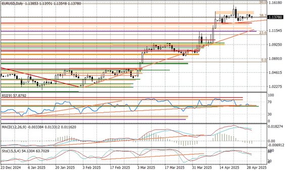 Dane o PKB z Niemiec nie przynoszą większych emocji, podobnie jak ranny odczyt sprzedaży detalicznej, czy też inflacja we Francji. Para EURUSD pozostaje poniżej 1,14 i zdaje się czekać na wieści z USA. Technicznie dzienne wskaźniki przemawiają za spadkami, ale równie dobrze można określić ten stan jako chłodzenie oscylatorów, przed ich dalszymi wzrostami. Technicznie ważne wsparcia mamy przy 1,1310 (linia szyi hipotetycznej formacji RGR), ale kluczowe będą 1,1275 i 1,1200.