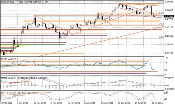 Para EURUSD próbowała dzisiaj nieco odbić po ostatnich spadkach, ale rejon 1,1572-1,1630 spełnia swoją rolę jako silny opór. Dane o PKB za II kwartał w strefie euro wypadły nieco lepiej od oczekiwań - odnotowano wzrost o 0,1 proc. k/k i 1,4 proc. r/r - choć jest to i tak gorzej, niż w I kwartale. Ekonomiści raczej powinni liczyć się też z tym, że przez cła Trumpa, kolejny kwartał może nie być lepszy i finalnie europejska gospodarka może popaść w marazm. Tym samym euro słusznie nie reaguje na dzisiejsze dane.