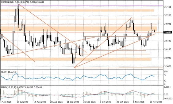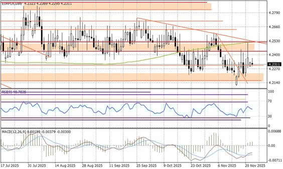 W poniedziałek rano za euro płaci się nieco ponad 4,23 zł, czyli o 2 grosze poniżej najwyższych poziomów z piątku. Technicznie EURPLN potwierdził tylko znaczenie oporu wokół 4,25, gdzie przebiega krótkoterminowa linia trendu spadkowego rysowana po szczytach od końca września b.r.