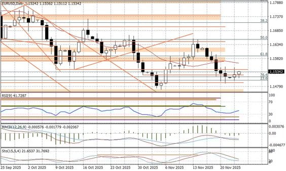 Widoczny wczoraj brak sił na trwalsze wyjście ponad techniczny opór przy 1,1541, sygnalizuje nieco dłuższą konsolidację w zakresach powyżej kluczowych okolic 1,15. Para EURUSD czeka na mocniejsze impulsy. Opublikowane rano dane nt. niemieckiego PKB za III kwartał (finalnie 0,3 proc. r/r) to za mało, istotniejsze dane mamy po południu z USA, w tym wyliczenia Conference Board o godz. 16:00. Niemniej brak mocniejszej reakcji na ostatnie skoki oczekiwań, co do grudniowej obniżki stóp przez FED, pokazuje, że rynek bardziej czeka na wyjaśnienia kwestii zakończenia programu QT z początkiem grudnia.