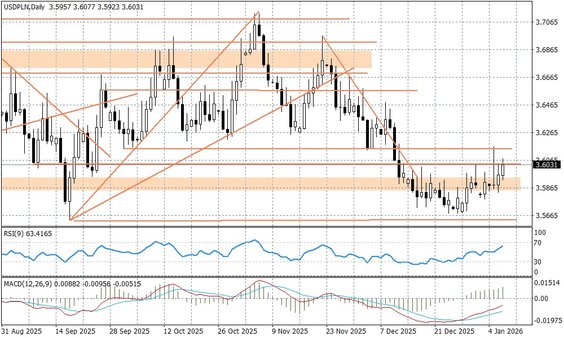 Teoretycznie temat Wenezueli wydaje się być załatwiony, ale nie jest to do końca prawda, chociaż wpis prezydenta USA w social mediach o tym, że zlecił on Sekretarzowi ds. Energii zajęcie się tematem sprzedaży 30-50 mln baryłek wenezuelskiej ropy w porozumieniu z rządem w Caracas, może sugerować, że reżim zaczyna iść na współpracę z Amerykanami. Niemniej otwarta nadal pozostaje reakcja Chin i Rosji na ostatnie wydarzenia. Poza wątkiem wenezuelskim ważniejsze dla rynków mogą być też tematy związane z wyborem nowego szefa FED (jeżeli Trump postawi na Warsha, a nie Hassetta to rynek zareaguje z ulgą, ale w krótkim okresie nie osłabi to dolara, a wręcz odwrotnie), czy też reakcją na oczekiwany wyrok Sądu Najwyższego USA ws. ceł. Potencjalny chaos może podbić awersję do ryzyka i umocnić dolara. Za wzrostem amerykańskiej waluty w najbliższych tygodniach przemawiają też czynniki w postaci danych makro (odczyt ze strefy euro wypadły gorzej, co będzie rzutować na euro), zwłaszcza w kontekście oczekiwań, co do ruchów FED-u - nieco słabsze dane ISM (zobaczymy jak dzisiaj wypadną usługi o godz. 16:00) nie dają argumentów za rozegraniem przez rynki bardziej "gołębiego" scenariusza w temacie cięć stóp procentowych w sytuacji, kiedy kluczowa pozostanie inflacja (ta jest podwyższona), a nadchodzące dane z rynku pracy (dzisiaj ADP i JOLS, w piątek odczyty Departamentu Pracy) mogą faktycznie pokazać na ile mamy do czynienia z jego koniunkturalną słabością (argument za większym luzowaniem polityki monetarnej), a na ile ze zmianami strukturalnymi (każe FED czekać i obserwować sytuację, a nie spieszyć się z cięciami stóp).