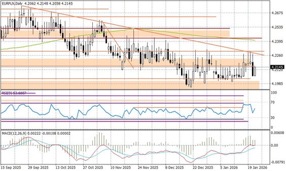 Eskalacji dalszego impasu pomiędzy USA, a Unią Europejską w temacie Grenlandii zapobiegł sekretarz generalny NATO, Mark Rutte, który zaproponował Donaldowi Trumpowi kompromisowe rozwiązania zwiększające bezpieczeństwo USA, przy jednoczesnym zachowaniu jedności NATO. Amerykanie dostaną zgodę od Duńczyków na zwiększenie liczby baz wojskowych, które będą traktowane na zasadzie eksterytorialności, tak jak brytyjskie bazy wojskowe na Cyprze. W odpowiedzi prezydent USA zapowiedział wycofanie karnych ceł za Grenlandię, które miały wejść w życie 1 lutego. Temat, który pojawił się w weekend i mocno wstrząsnął rynkami, szybko wypadł z wokandy. Efekt TACO, czy spryt i doświadczenie dyplomatyczne europejskich polityków, którzy zagrali mocnymi kartami wobec USA? A może jedno i drugie? Niesmak pozostał jednak na rynkach. Wall Street wprawdzie wymazała już sporą część spadków, ale inwestorzy zdaje się, że nie wiedzą co zrobić dalej z dolarem... EURUSD pozostaje względnie wysoko, chociaż już poniżej poziomu 1,17.