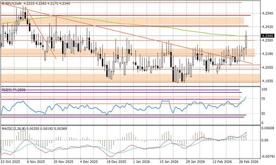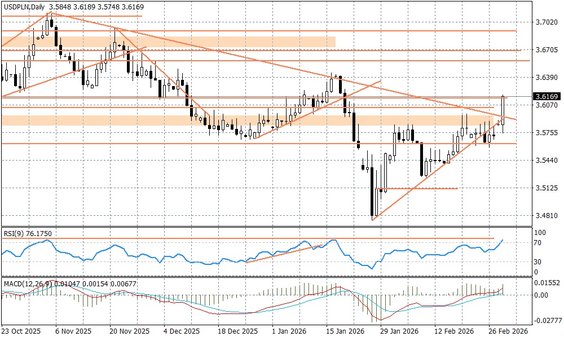 Nie dziwi, zatem silny ruch na USDPLN, który wyraźnie przebił poziom oporu przy 3,60 i zbliża się do 3,62. To pokłosie spadku EURUSD w okolice 1,17. W przypadku EURPLN wybiliśmy opór przy 4,23, co może otwierać drogę do ruchu w stronę 4,25. Obecnie para jest kwotowana przy 4,2350. Z informacji z kraju warto wspomnieć o piątkowej decyzji agencji Fitch - nic się nie zmieniło, chociaż to nie powinno napawać optymizmem. Perspektywa ratingu pozostaje negatywna, co grozi jego obniżeniem w przyszłości, jeżeli polskie władze nie podejmą działań zmierzających do naprawy publicznych finansów. To jednak na razie nie ma dla rynków większego znaczenia. Istotniejsze będzie zaplanowane na środę posiedzenie Rady Polityki Pieniężnej. Teoretycznie obniżka stóp procentowych o 25 punktów baz. była już "przesądzona", ale w obecnej sytuacji, gdyby została odsunięta na kwiecień, to nie powinno być to nadmiernym zaskoczeniem - łatwo będzie to wytłumaczyć nadmierną zmiennością na rynkach globalnych.