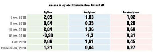 Dane prezentowane w InfoDługu uwzględniają płatności wynoszące min. 200 zł opóźnione o co najmniej 30 dni, kłopoty z obsługą rat kredytowych raportowane są z bazy BIK, a niepłacone w terminie bieżące rachunki z Rejestru Dłużników BIG InfoMonitor. Z uwagi na opóźnienie, z jakim wierzyciele wprowadzają informacje o długach do Rejestru Dłużników BIG InfoMonitor, problemy wynikające z lockdownu na większą skalę będą tu widoczne w kolejnych miesiącach. Natomiast opóźnienia rat kredytów monitorowanych przez BIK widoczne są od razu i to one dokładając 0,94 mld zł, przesądziły o tym, że w kwietniu i maju zaległości Polaków przyrosły o 1,21 mld zł.