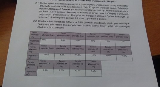 Z materiałów przekazanych przez spółkę wynika, że niespłacona część długów zostanie w całości umorzona. Nie ma natomiast mowy o konwersji obligacji na akcje.