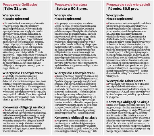 Zacznijmy od tego, co może wydarzyć się we wtorek, o ile w ogóle się coś wydarzy. Od pewnego czasu bowiem zarówno sama spółka, jak i ustanowiona rada wierzycieli zabiegały, aby termin zgromadzenia wierzycieli został przesunięty na początek października. To miałoby dać spółce więcej czasu m.in. na znalezienie inwestora (z informacji GetBacku wynika, że ma w tej chwili podpisanych 11 umów o poufności), wypracowanie bardziej dokładnych propozycji układowych czy chociażby na negocjacje z wierzycielami zabezpieczonymi, którzy mogliby dołączyć do układu. Rada wierzycieli w tej sprawie zwróciła się nawet do KNF, która obiecała, że zgłosi się z taką prośbą do sądu. Do zamknięcia tego wydania „Parkietu" nie było żadnej decyzji odnośnie do tego, aby zebranie wierzycieli miało się nie odbyć. Nie można jednak wykluczyć, że owszem, zebranie się odbędzie, ale do głosowania w sprawie układu nie dojdzie. Możliwe, że zostanie ogłoszona przerwa i tym samym spółka zyska nieco na czasie.