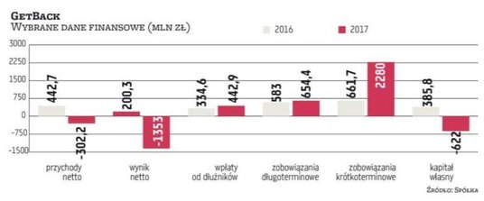 GetBack zaraportował m.in. 1,35 mld zł straty netto i ujemne przychody w wysokości ponad 302 mln zł. To ma przede wszystkim związek z aktualizacją wycen portfeli wierzytelności. Zobowiązania spółki na koniec 2017 r. wynosiły 2,93 mld zł, z czego aż 2,28 mld zł to zobowiązania krótkoterminowe.