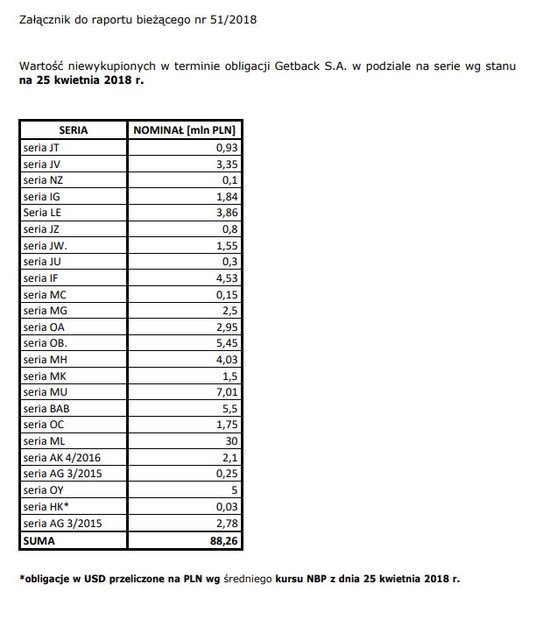 „Na dzień 25 kwietnia 2018 r. łączna wartość nominalna niewykupionych w terminie Obligacji wynosiła 88,26 mln zł. Ponadto łączna wartość niewypłaconych w terminie odsetek od Obligacji na dzień 25 kwietnia 2018 r. wynosiła 3,32 mln zł. Jednocześnie Zarząd GetBack zastrzega, że przedstawione dane nie podlegały badaniu przez podmiot uprawniony do badania sprawozdań finansowych. Szczegóły dotyczące powyższych informacji zostały przekazane w załączeniu do niniejszego raportu” – dodała windykacyjna spółka.