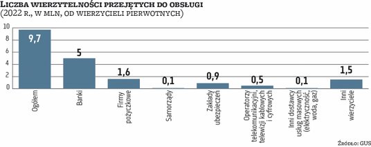 Według stanu na koniec 2022 r. przedsiębiorstwa windykacyjne obsługiwały 18,1 mln czynnych wierzytelności (bez funduszy inwestycyjnych zewnętrznych) o łącznej wartości nominalnej 147,1 mld zł. Tu na wierzytelności konsumenckie przypadało jeszcze więcej, bo 76,3 proc. ogólnej kwoty, zaś na korporacyjne – 23,7 proc. Wśród ogółu wierzycieli pierwotnych dla wierzytelności konsumenckich największą grupę stanowiły banki (66,7 proc.) oraz firmy pożyczkowe (18 proc.). Reszta to niespłacone zobowiązania wobec m.in. zakładów ubezpieczeń, jednostek samorządu terytorialnego, operatorów telekomunikacyjnych, dostawców telewizji kablowej i cyfrowej, a także dostawców wody, gazu i elektryczności.