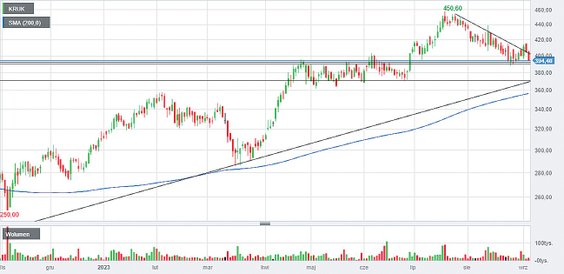 Kupującym nie pozostaje więc nic innego, jak znów zebrać siły i bronić się w strefie, w którą znów wraca kurs Kruka. Zasięg zmagań może znów sięgnąć 389 zł. W razie powodzenia, na wykresie wyrysowałaby się formacja podwójnego dna. Szanse popytu są dość spore, zważywszy na siłę wsparcia.