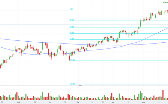 W ostatnich dniach można zauważyć wzrost obrotów akcjami Kruka, któremu towarzyszy wyhamowanie, a nawet zmiana trendu w krótkim terminie. Miejsce nieprzypadkowe, bo popyt zareagował dokładnie w strefie, w której nakłada się na siebie kilka wsparć. Po pierwsze, mowa o 38,2-proc. zniesieniu fali wzrostowej, wyrysowanej od 23 czerwca. Co więcej, poziom ten pokrywa się z linią poprowadzoną przez szczyt sprzed ośmiu miesięcy.
