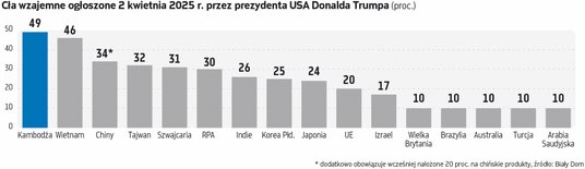 – 2 kwietnia 2025 r. na zawsze zostanie zapamiętany jako dzień odrodzenia się amerykańskiego przemysłu, dzień odzyskania przeznaczenia Ameryki i dzień, w którym zaczęliśmy ponownie czynić Amerykę bogatą, dobrą i zamożną – mówił w środę wieczorem Trump. Przedstawił wówczas mechanizm tzw. ceł wzajemnych. Przewiduje on, że od 5 kwietnia towary sprowadzane od większości partnerów handlowych USA będą obłożone dodatkowym 10-proc. cłem. Do tej grupy, oclonej stawką „minimalną”, zostały zaliczone m.in.: Wielka Brytania, Brazylia, Turcja i Arabia Saudyjska. Pozostałe kraje, obwiniane przez Waszyngton o stosowanie zbyt wysokich barier dla eksportu produktów amerykańskich, zostaną od 9 kwietnia oclone mocniej. (Z podwyżek będą wyłączone niektóre produkty, głównie surowce takie jak ropa, miedź czy drewno). Na dobra importowane z Unii Europejskiej zostanie nałożone 20-proc. cło. Dla Japonii będzie ono wynosiło 24 proc., dla Indii 26 proc., dla Szwajcarii 31 proc., a dla Tajwanu 32 proc. Chiny zostaną dotknięte cłem wynoszącym 34 proc., do którego trzeba jednak dodać nałożone kilka tygodni temu 20-proc. cło oraz podwyżki ceł z czasów pierwszej administracji Trumpa.