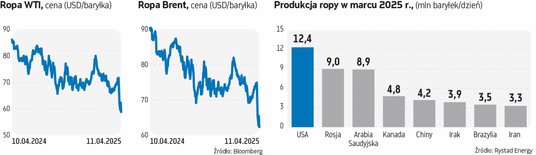 Trump apelował również do państw grupy OPEC+, by zwiększyły wydobycie i przyczyniły się do spadku cen. OPEC+ rzeczywiście zdecydowała się zwiększyć wydobycie od kwietnia o 250 tys. baryłek surowca dziennie. Część krajów tej grupy czuła się już wcześniej nadmiernie ograniczona skoordynowanymi cięciami w produkcji wdrażanymi od 2022 r. Uznała więc, że może sobie pozwolić na umiarkowaną zwyżkę wydobycia. 3 kwietnia, czyli dzień po tym, jak Trump ogłosił swoje szokujące cła, OPEC+ zaskoczyła jednak rynek, decydując się przyspieszyć w maju wzrost wydobycia do 411 tys. baryłek dziennie. Ta decyzja była trudna do wytłumaczenia, jeśli bierzemy pod uwagę czynniki czysto ekonomiczne.