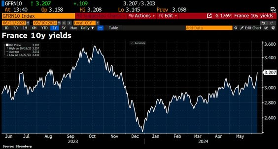 Macron zwołał wybory w desperackiej próbie powstrzymania awansu swojej skrajnie prawicowej rywalki Marine Le Pen po miażdżącej porażce w niedzielnych wyborach do Parlamentu Europejskiego. – Prawicowa większość we (francuskim parlamencie) przeszkodziłaby w realizacji jakichkolwiek planów reform. Obraz deficytu we Francji jest już słaby, co jeszcze bardziej pogłębiłoby obawy rynku – napisał Mohit Kumar, główny ekonomista ds. Europy w banku inwestycyjnym Jefferies.