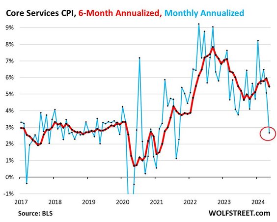 CPI usług podstawowych wzrósł w maju o 2,7 proc. w ujęciu rocznym w stosunku do kwietnia (0,22 proc. nie w ujęciu rocznym), co stanowi najmniejszy wzrost od października 2021 r. Tego rodzaju wartości odstające nie tworzą trendu; wkrótce się odwrócą, jak pokazały wszystkie inne wartości odstające w usługach podstawowych. Ta ogromna wartość odstająca z jednego miesiąca obniżyła odczyt za sześć miesięcy. Sześciomiesięczny wskaźnik CPI w usługach podstawowych wzrósł o 5,5 proc. w ujęciu rocznym, co stanowi pierwsze spowolnienie od października 2023 r.