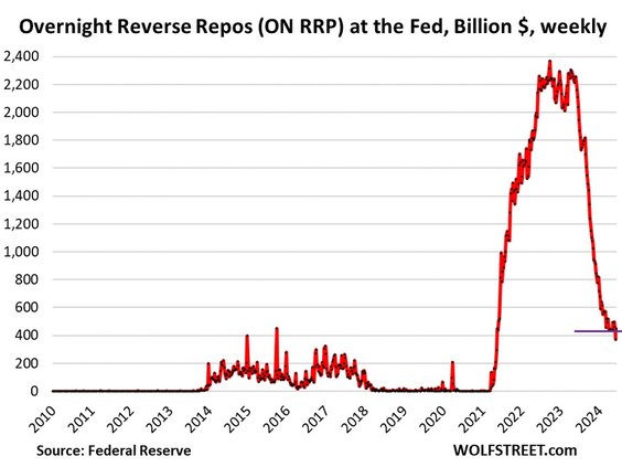 ON RRP reprezentują nadwyżkę środków pieniężnych, z którą rynki pieniężne nie wiedzą, co innego zrobić. ON RRP istnieją od dziesięcioleci, ale w normalnych czasach wynoszą zero lub prawie zero. A teraz wracają do normalnego poziomu.