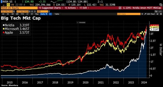 Apple odnotował nową rekordową kapitalizację rynkową na poziomie 3,57 biliona dolarów, podczas gdy Nvidia osiągnęła najwyższy od trzech tygodni poziom 3,32 biliona dolarów (czwarta co do wielkości firma na świecie, spółka macierzysta Google, Alphabet, ma kapitalizację rynkową na poziomie 2,37 biliona dolarów).