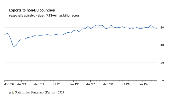 Niemiecki eksport do krajów spoza Unii Europejskiej (kraje trzecie) spadł w czerwcu 2024 r. w porównaniu z majem 2024 r. o 2,6 proc.. Według wstępnych danych Federalnego Urzędu Statystycznego (Destatis) Niemcy wyeksportowały do tych krajów towary o wartości 58,0 mld euro w czerwcu 2024 r.