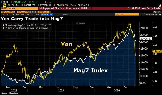 Wygląda na to, że wpływy z carry trade jenem zasiliły indeks Mag7. "Magnificent Seven" to sformułowanie,. które ukuł analityk Bank of America, Michael Hartnett 2023 r., komentując siedem firm powszechnie wysoko ocenianych za ich dominację na rynku, wpływ technologiczny oraz zmiany w zachowaniach konsumentów i trendach gospodarczych: Alphabet, Amazon, Apple, Meta Platforms, Microsoft, NVIDIA i Tesla. Ich działalność obejmuje cztery sektory: usługi technologiczne, technologie elektroniczne, handel detaliczny i dobra konsumpcyjne trwałego użytku. Działają w następujących branżach: oprogramowanie/usługi internetowe, sprzęt telekomunikacyjny, sprzedaż detaliczna w Internecie, oprogramowanie pakietowe, półprzewodniki i pojazdy silnikowe.