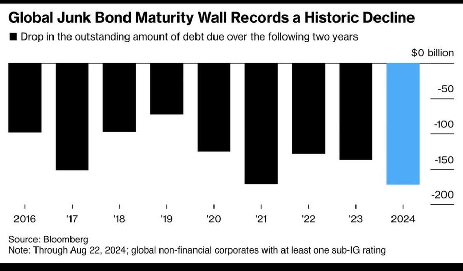 Erozja bariery zapadalności – termin rynkowy określający dużą kwotę zadłużenia przypadającą w tym samym terminie – łagodzi obawy związane z potencjalną falą niewypłacalności. Ryzykowni pożyczkobiorcy refinansują przy wyższych stopach procentowych, otrząsając się z obaw, że zostaną obciążeni niezrównoważonymi kosztami zadłużenia, co doprowadzi do bankructw i zwolnień z efektami domina dla realnej gospodarki. Zamiast tego inwestorzy próbujący zablokować rentowności przed przewidywanymi obniżkami stóp procentowych wzmocnili popyt, utrzymując spready na niskim poziomie.