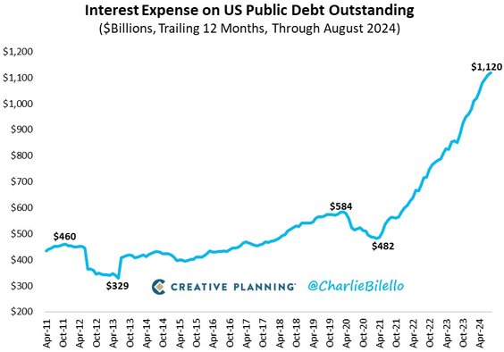 Odejmując odsetki zarabiane przez rząd od swoich inwestycji, płatności odsetkowe netto wyniosły 843 miliardy dolarów, czyli więcej niż w przypadku jakiejkolwiek innej kategorii z wyjątkiem ubezpieczeń społecznych i opieki zdrowotnej. Skok kosztów obsługi długu nastąpił wraz ze wzrostem deficytu budżetowego USA w sierpniu, który w całym roku zbliżył się do 2 bilionów dolarów.