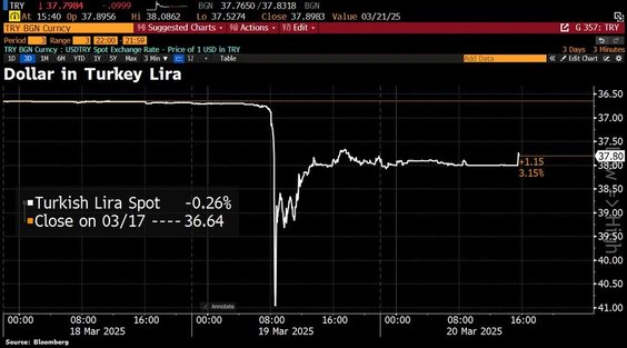 Podwyżka stopy overnight pozwoliłaby decydentom podnieść średni koszt finansowania, jakiego udzielają pożyczkodawcom komercyjnym, i zapobiec słabszej lirze, która mogłaby wywołać inflację. Bank poinformował, że zawiesi udzielanie pożyczek po niższej stopie repo tygodniowego — która wynosi 42,5 proc. — na nieokreślony okres. Decyzje zapadły dzień po zatrzymaniu przez władze tureckie ważnego polityka opozycji, co wstrząsnęło rynkami.