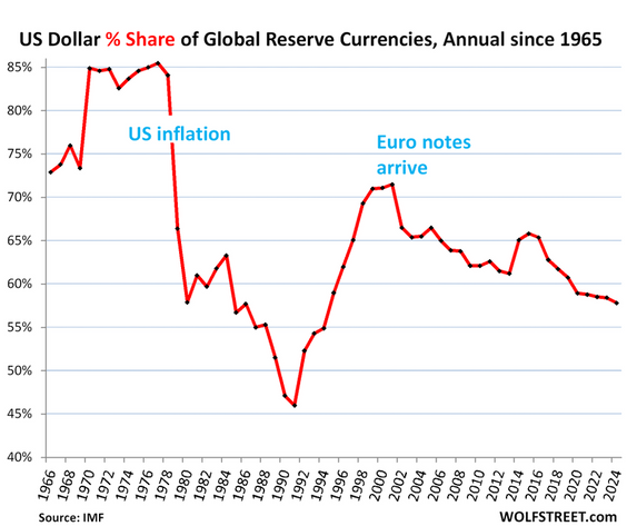 Status dolara amerykańskiego jako dominującej globalnej waluty rezerwowej pomógł USA sfinansować ich podwójne deficyty, a tym samym umożliwił im: ogromny deficyt fiskalny każdego roku i ogromny deficyt handlowy każdego roku. Status waluty rezerwowej pochodzi od innych banków centralnych (nie Fed), które kupiły biliony aktywów denominowanych w USD, takich jak papiery wartościowe skarbowe, inne papiery wartościowe rządowe, obligacje korporacyjne, a nawet akcje. - Status dolara jako dominującej waluty rezerwowej był kluczowy dla USA, a ponieważ ta dominacja spada tak powoli, ryzyka narastają tak powoli – zauważa Wolf Richter.