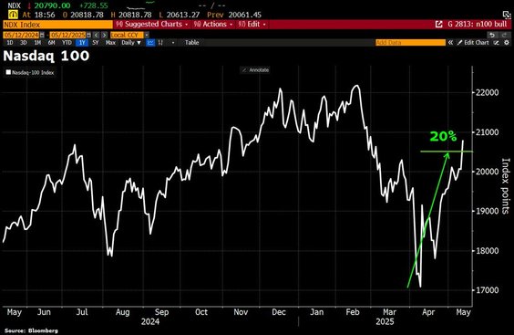 Jednocześnie spadły defensywne instrumenty rynku od obligacji do złota i bezpiecznych walut. Dolar wzrósł najbardziej od czasu listopadowego rajdu po wyborach. Odbicie apetytu na ryzyko i zmniejszone oczekiwania na recesję doprowadziły indeks giełdowy powyżej poziomu „Dnia Wyzwolenia” prezydenta Donalda Trumpa z 2 kwietnia. Gwałtowny wzrost dużych firm technologicznych ponownie wprowadził Nasdaq 100 na rynek byka zaledwie miesiąc po tym, jak spadł o 20 proc. z poprzedniego rekordu. Pośród potencjalnego resetu oczekiwań inflacyjnych, rentowność obligacji skarbowych wzrosła, ponieważ inwestorzy obniżyli swoje przewidywania co do posunięć Fed do zaledwie dwóch obniżek stóp procentowych w 2025 r.
