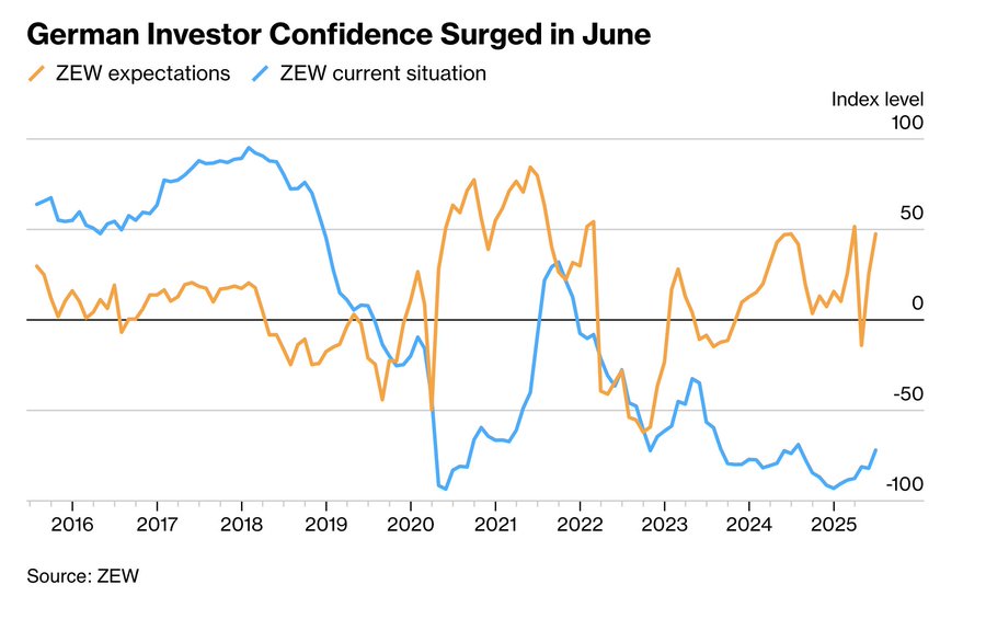 Indeks oczekiwań ZEW – kluczowy wskaźnik nastrojów gospodarczych – wzrósł dla Niemiec do 47,5 w czerwcu, z 25,2 w maju i znacznie powyżej konsensusu Bloomberga na poziomie 35. Nawet indeks bieżących warunków wykazał pewną poprawę, wzrastając do -72,0 z -82,0 w poprzednim miesiącu — nadal na minusie, ale zmierzając we właściwym kierunku.