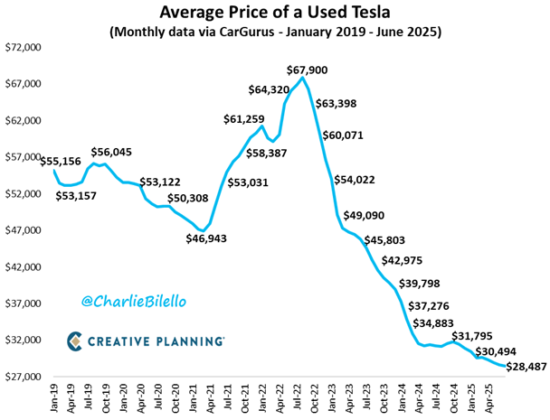 Chociaż Tesla nadal sprzedaje więcej samochodów niż jakikolwiek inny producent pojazdów elektrycznych, to był dla niej jak dotąd trudny rok. Po tym, jak na początku 2025 r. sprzedaż nie spełniła oczekiwań, Tesla zareagowała, obniżając ceny nowych samochodów i zalewając rynek samochodów używanych ofertami w rozliczeniu, co przyczyniło się do dalszego obniżenia cen samochodów używanych.