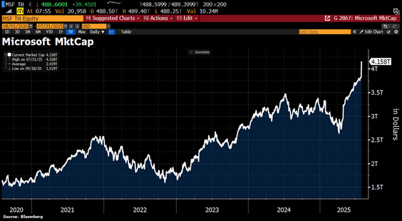 Akcje wzrosły o ponad 9 proc. po zamknięciu sesji po publikacji mocnego raportu zysków Microsoftu. W rezultacie Microsoft dołączył do Nvidii jako jedyna firma, której kapitalizacja rynkowa przekroczyła 4 biliony dolarów.