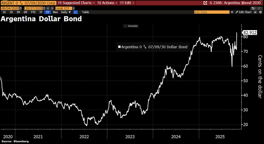 Wartość międzynarodowych obligacji wzrosła o 7–13 centów każda, akcje lokalne wzrosły o 22 proc., a peso umocniło się o około 4 proc. w stosunku do dolara, po początkowym wzroście o blisko 15 proc.