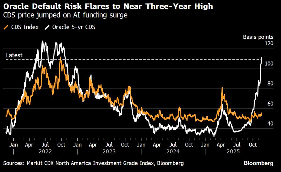 W ostatnich miesiącach gracze masowo inwestowali w swapy kredytowe firmy Oracle, ponieważ ogromne wydatki związane ze sztuczną inteligencją, kluczowa rola firmy w sieci powiązanych transakcji i słabsze oceny kredytowe w porównaniu z takimi graczami jak Microsoft Corp. czy Alphabet Inc. sprawiły, że kontrakty te stały się preferowanym przez rynek sposobem zabezpieczenia się przed boomem na sztuczną inteligencję i obstawiania przeciwko niemu.