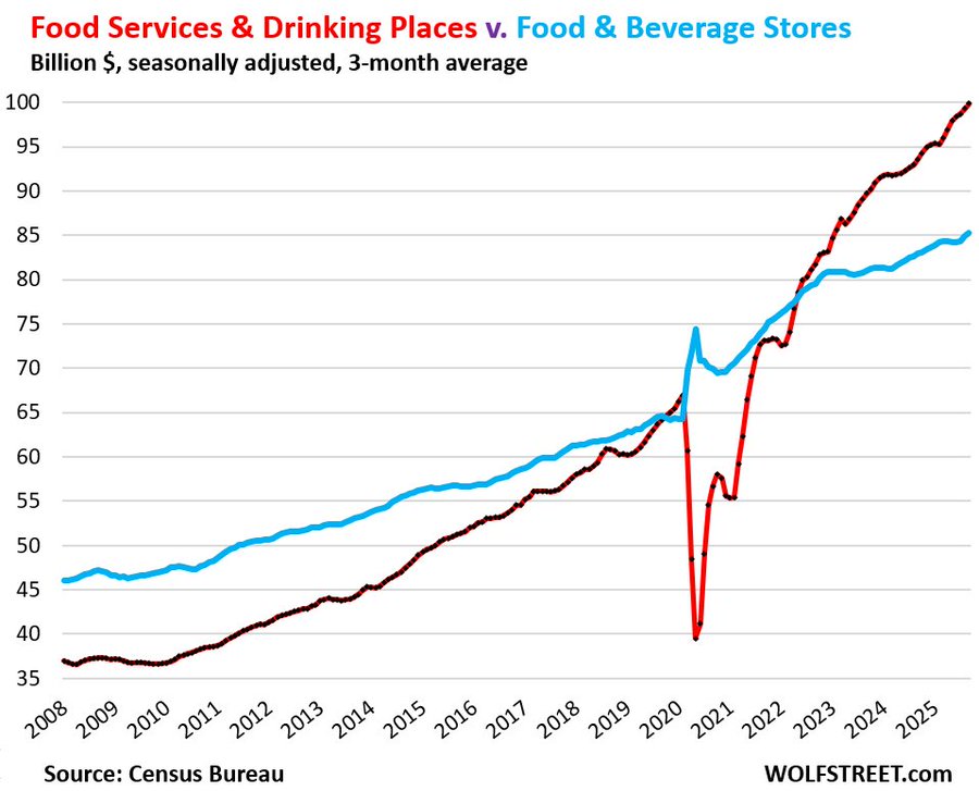 Większość wydatków w restauracjach i barach – „gastronomii i lokalach gastronomicznych”, jak się je nazywa – ma charakter uznaniowy. Amerykanie mogliby jeść i pić w domu, mogliby zabrać lunch do pracy itd., ale wolą jeść na mieście. Pomimo kiepskiego nastroju Amerykanów, sprzedaż w tych lokalach stale rośnie, znacznie przewyższając sprzedaż w sklepach spożywczych i napojowych, a dystans między nimi stale się powiększa.