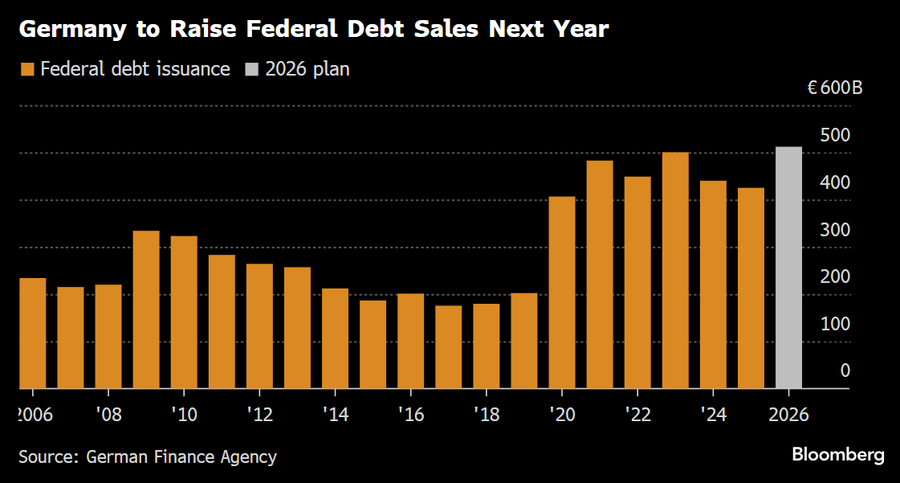 Frankfurcka agencja finansowa, zarządzająca długiem publicznym, planuje sprzedać papiery wartościowe o wartości około 318 miliardów euro na rynkach kapitałowych z terminem zapadalności do 30 lat poprzez aukcje oraz 176 miliardów euro za pośrednictwem rynku pieniężnego. Zostaną również wyemitowane zielone obligacje o wolumenie od 16 do 19 miliardów euro.
