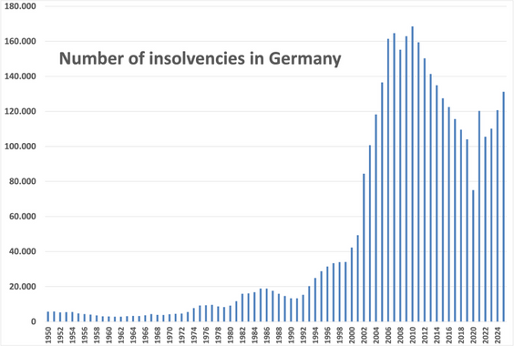 Według ostatecznych wyników, w październiku 2025 r. sądy lokalne zgłosiły łącznie 2108 wniosków o ogłoszenie upadłości przedsiębiorstw. Było to o 4,8 proc. więcej niż w tym samym miesiącu roku poprzedniego. Sądy oszacowały wartość roszczeń wierzycieli z tytułu upadłości przedsiębiorstw zgłoszonych w październiku 2025 r. na około 2,6 mld euro. W październiku 2024 r. wartość roszczeń wyniosła około 3,8 mld euro. Ten spadek liczby roszczeń, pomimo rosnącej liczby upadłości przedsiębiorstw, wynika z faktu, że w październiku 2024 r. więcej przedsiębiorstw o znaczeniu gospodarczym złożyło wnioski o ogłoszenie upadłości niż w październiku 2025 r.