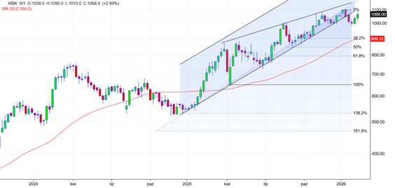 Podczas gdy szereg banków bije rekordy wycen, mBank ostatnio takim osiągnięciem mógł się pochwalić miesiąc temu. Na wykresie technicznym możemy dostrzec tworzącą się formację ramię-głowa-ramię, która powinna skutkować nadejściem przeceny. Jeśli formacja ta zacznie się realizować, jej zasięg można szacować na poziom około 900 zł. To zaś idealnie pokrywałoby się z 38,2-proc. zniesieniem fali wzrostowej, pociągniętej od kwietnia poprzedniego roku Zanegowaniem spadkowego scenariusza byłoby wyjście na nowy szczyt w najbliższych dniach. Byłby to oczywiście sygnał kontynuacji trendu wzrostowego. W szerszym okresie notowania mBanku poruszają się od około roku w ramach trójkąta zniżkującego, z którego w połowie stycznia nastąpiło wybicie dołem. Ostatnie zwyżki to próba powrotu do wspomnianej formacji - jak na razie nieudana. Odbicie od dolnego ograniczenia trójkąta wzmocni podaż.