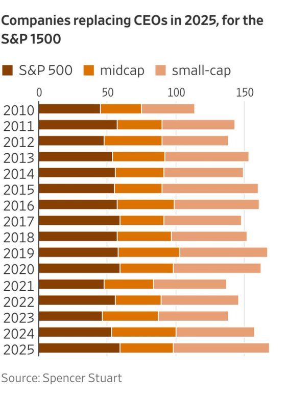 Jak podaje The Wall Street Journal, w 2025 r. w 1500 największych spółkach publicznych wymieniono mniej więcej jednego na dziewięciu dyrektorów generalnych korporacji. Jest to najwyższy wskaźnik rotacji od 2010 r., kiedy gospodarka podnosiła się po kryzysie finansowym z poprzedniego roku.