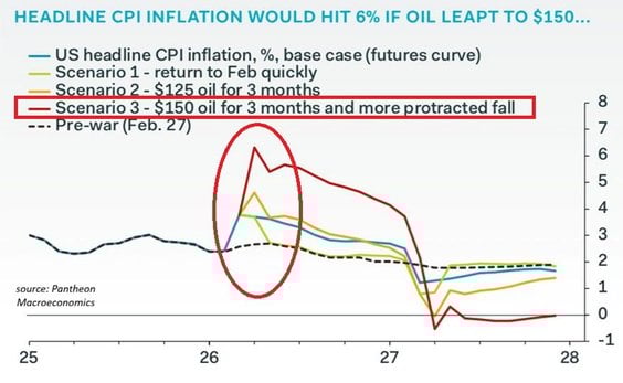 Jednak według Pantheon Macroeconomics, jeśli ceny ropy osiągną 150 dolarów za baryłkę i pozostaną wysokie przez trzy miesiące, inflacja wzrośnie do 6 proc., najwyższego poziomu od początku 2023 roku. Nawet jeśli cena będzie niższa i wyniesie przez trzy miesiące 125 dolarów, inflacja skoczy do 5 proc., prawie dwukrotnie przekraczając obecny poziom. Przed wojną z Iranem scenariusz bazowy zakładał stopniowy spadek inflacji do ok. 2 proc. do połowy 2026 roku.